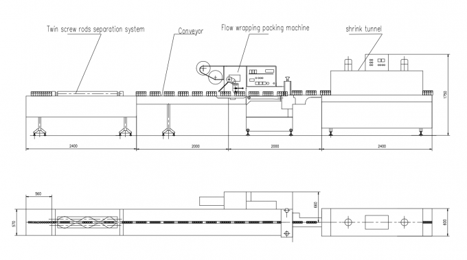 It connects directly with the production line, the milks bottles are standing up during packing process, the bottles will be automatically separated with 4 or 5 pcs in one group when passing through the automatic feeding and separation system , then the 4pcs/group or 5 pcs/group will go to the flow wrapping machine and be packed with shrink film.